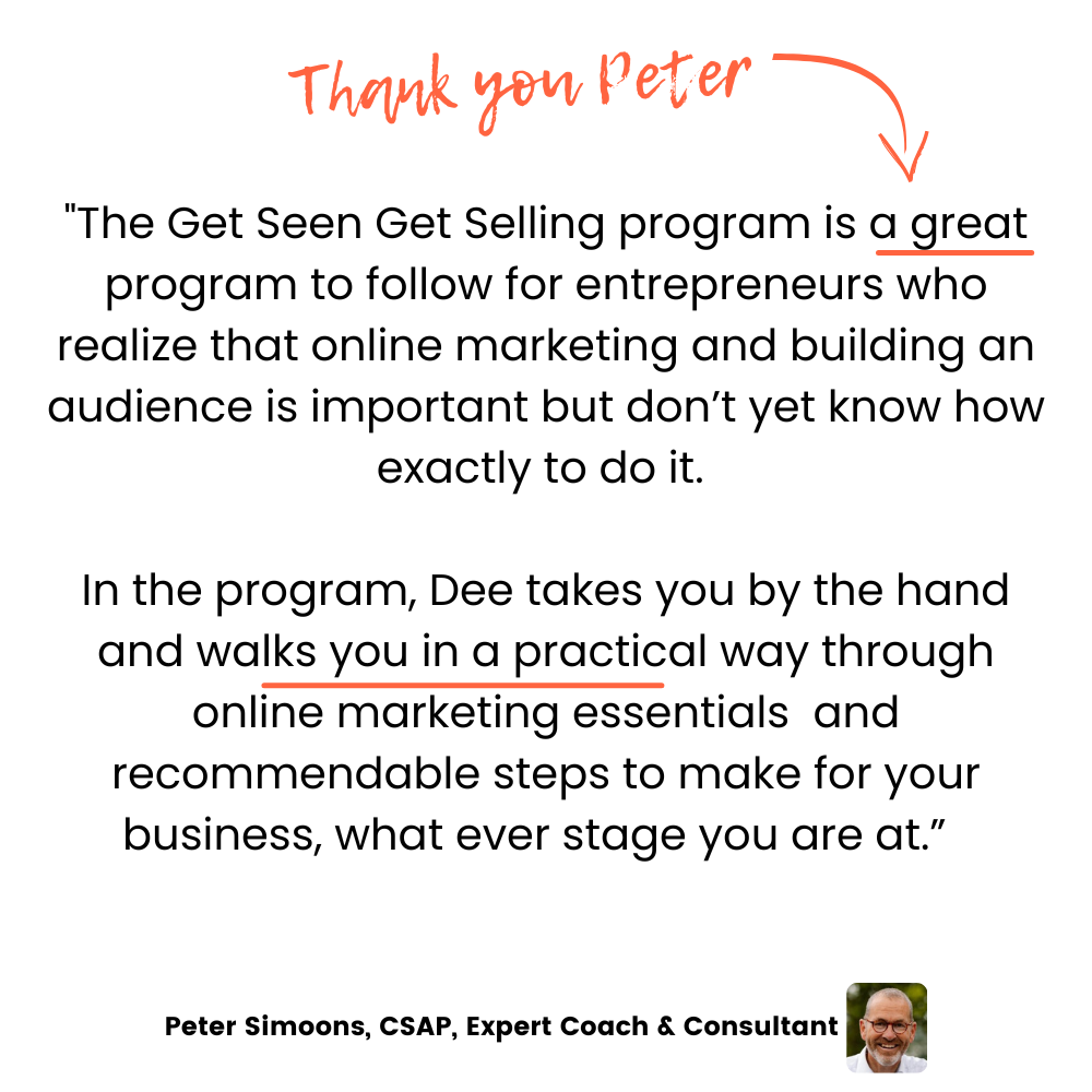 'Get Seen & Get Selling Online' is all about giving you the complete roadmap for growing your brand online. In just 90 days, this coach-led program will give you all the tools, knowledge and proven marketing strategies you need to confidently sell your offers online with ease and create long-term scaleable growth enabling you to earn more, but work less.